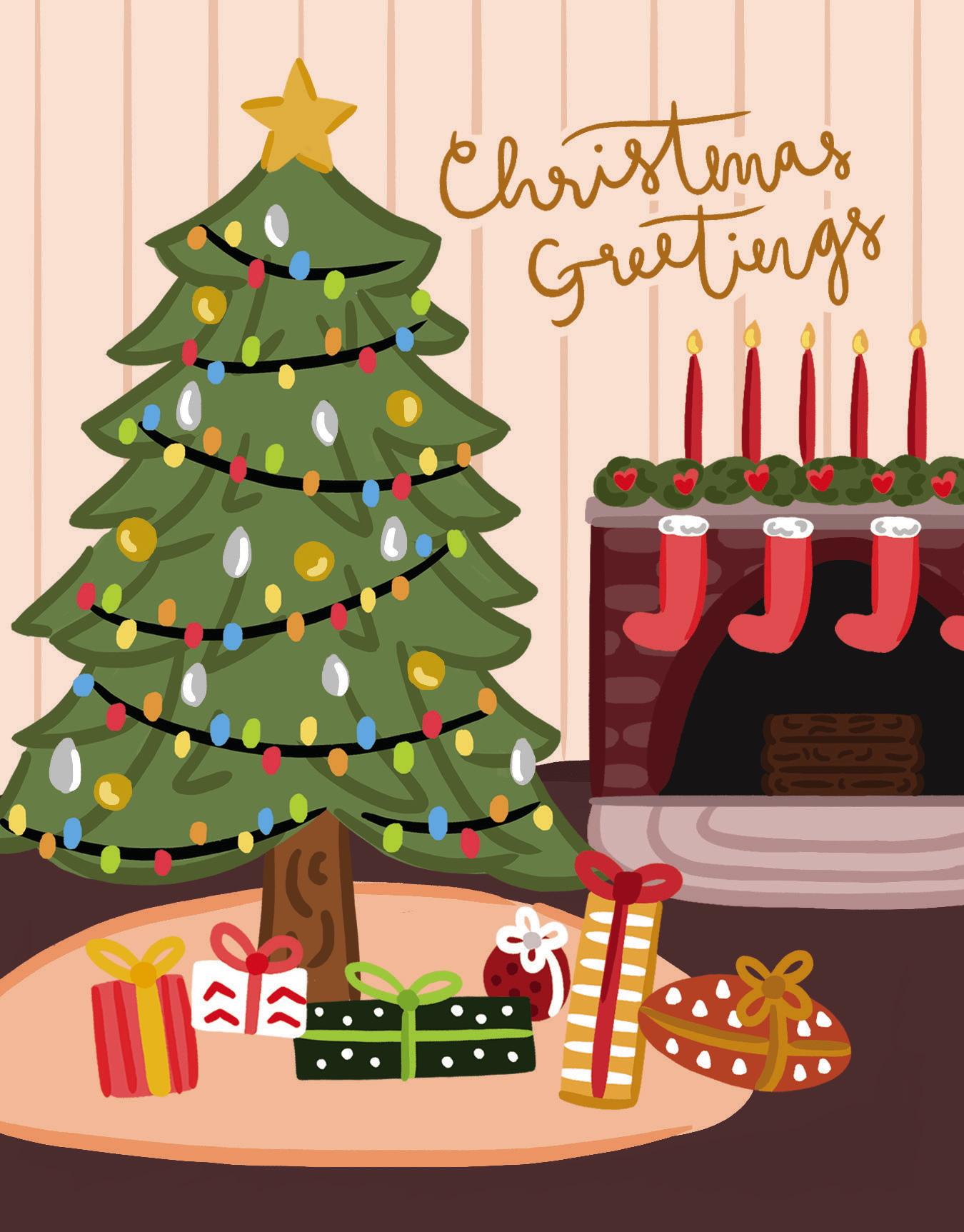Share warm holiday wishes with this delightful Christmas card featuring a decorated tree, colorful presents, and a cozy fireplace scene. Perfect for spreading festive cheer.