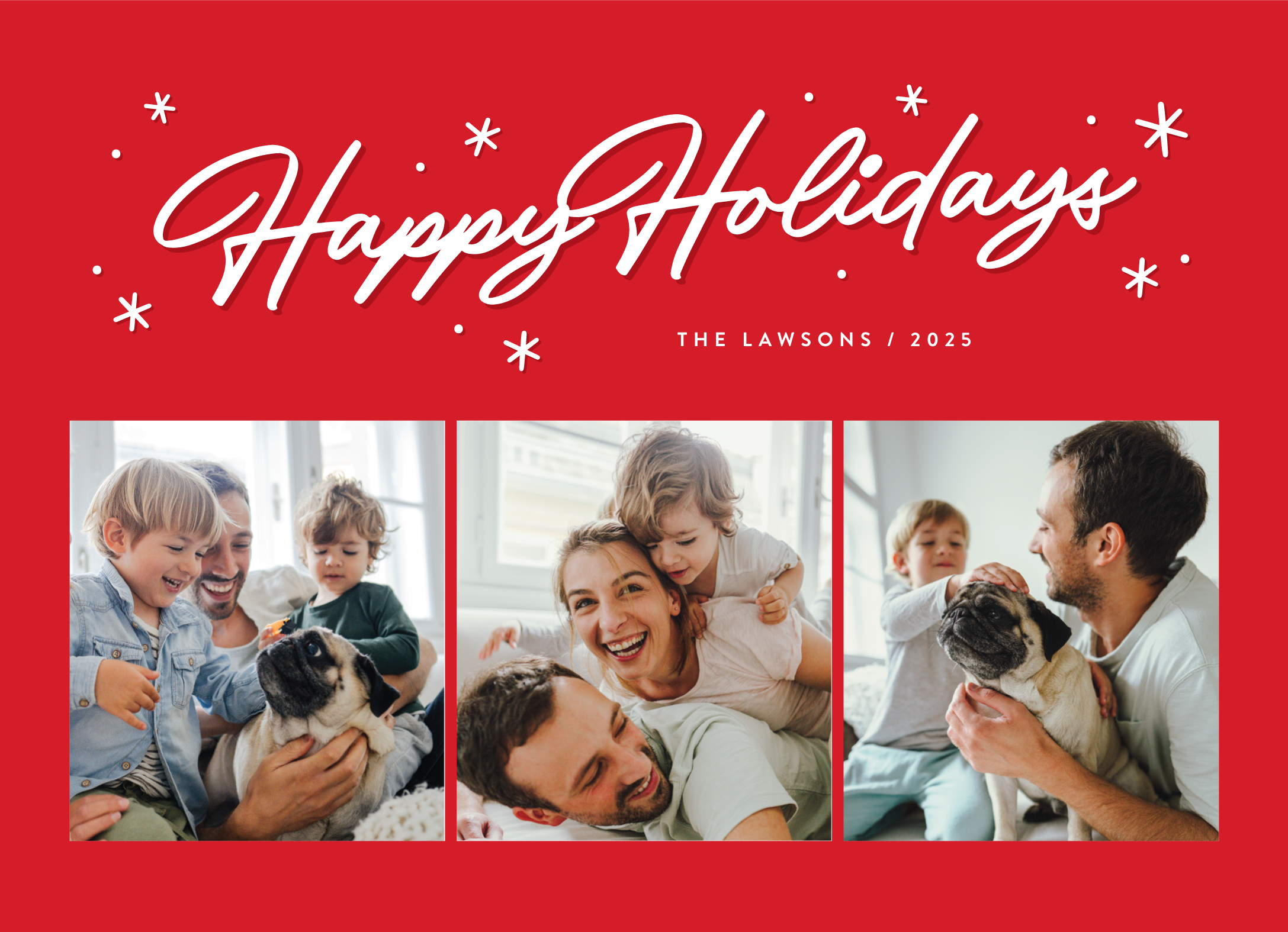 Celebrate the joy of the season with the 'Happy And Bold' holiday photo card from Postable.com. Customize with three of your cherished photos and make it uniquely yours with personalized text. The vibrant red design and festive text make it perfect for spreading holiday cheer.