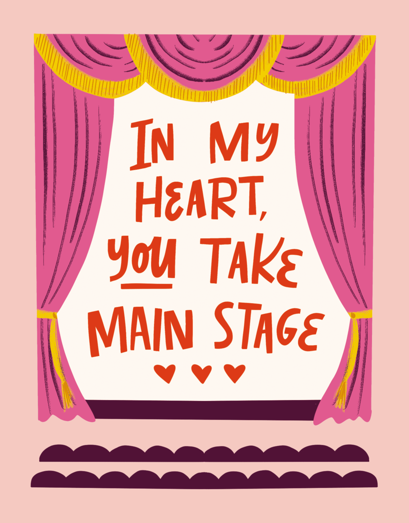 This charming Valentine's Day card features a vibrant stage design with the heartfelt message 'In my heart, you take main stage,' perfect for expressing love and admiration.