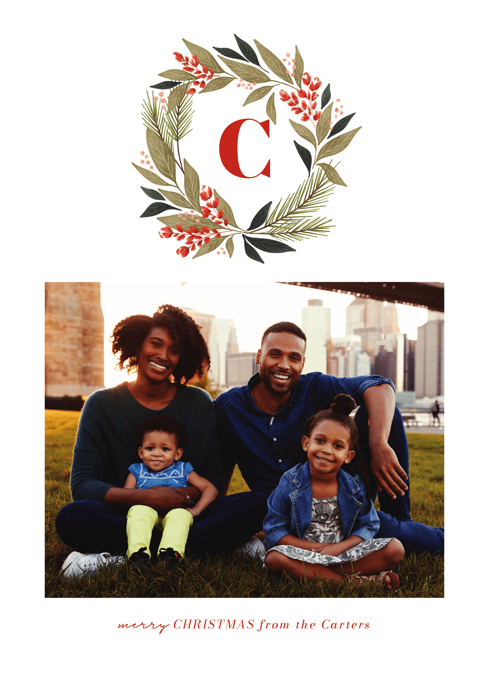 Celebrate the holidays with this elegant 'Monogrammed Wreath' Christmas card. Customize it with your festive family photo and personalized text for a unique seasonal greeting.