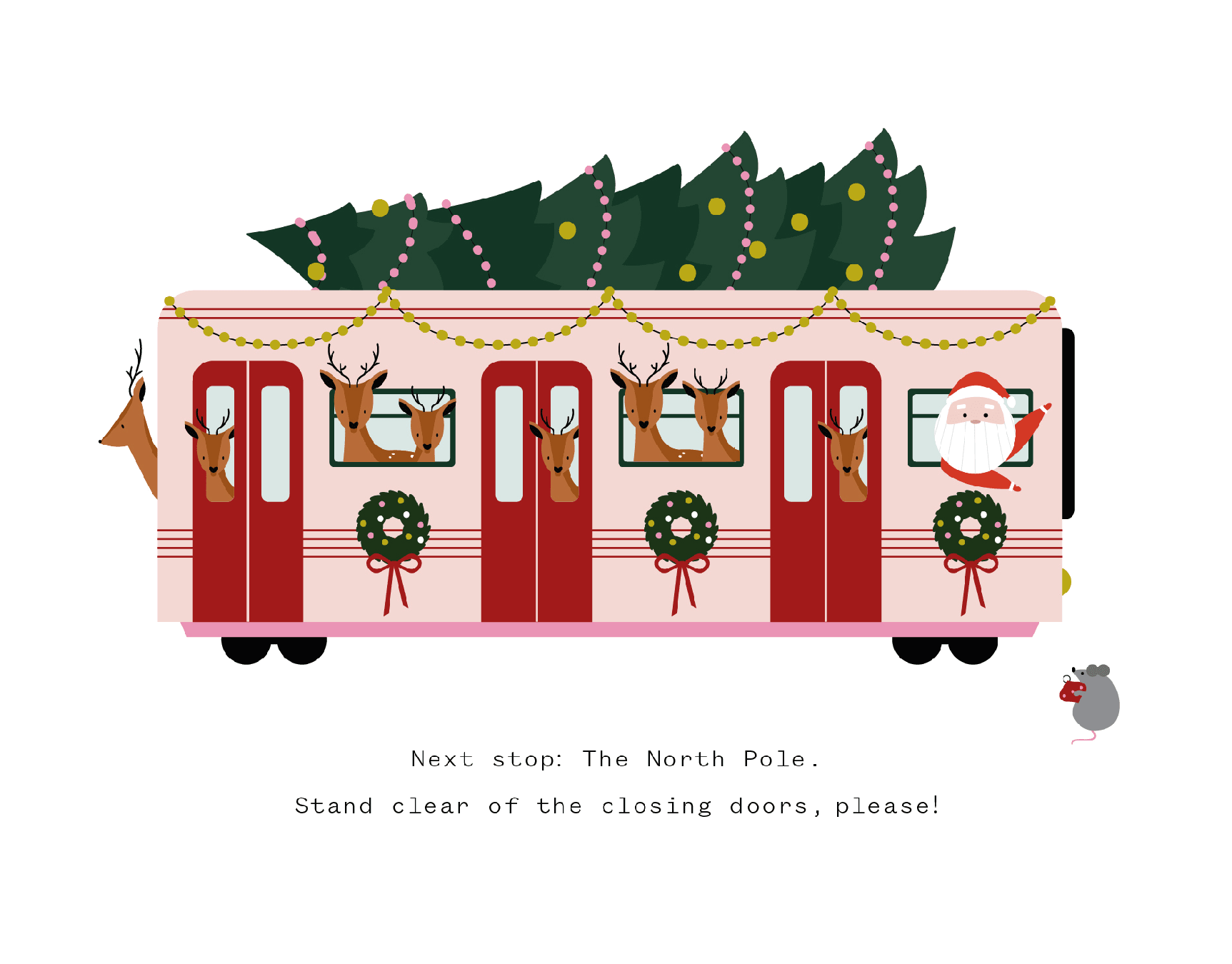 All aboard the festive Reindeer Train! This whimsical Christmas card features Santa and his reindeer on a charming journey to the North Pole, complete with holiday wreaths and a delightful Christmas tree. Perfect for spreading holiday cheer to loved ones.
